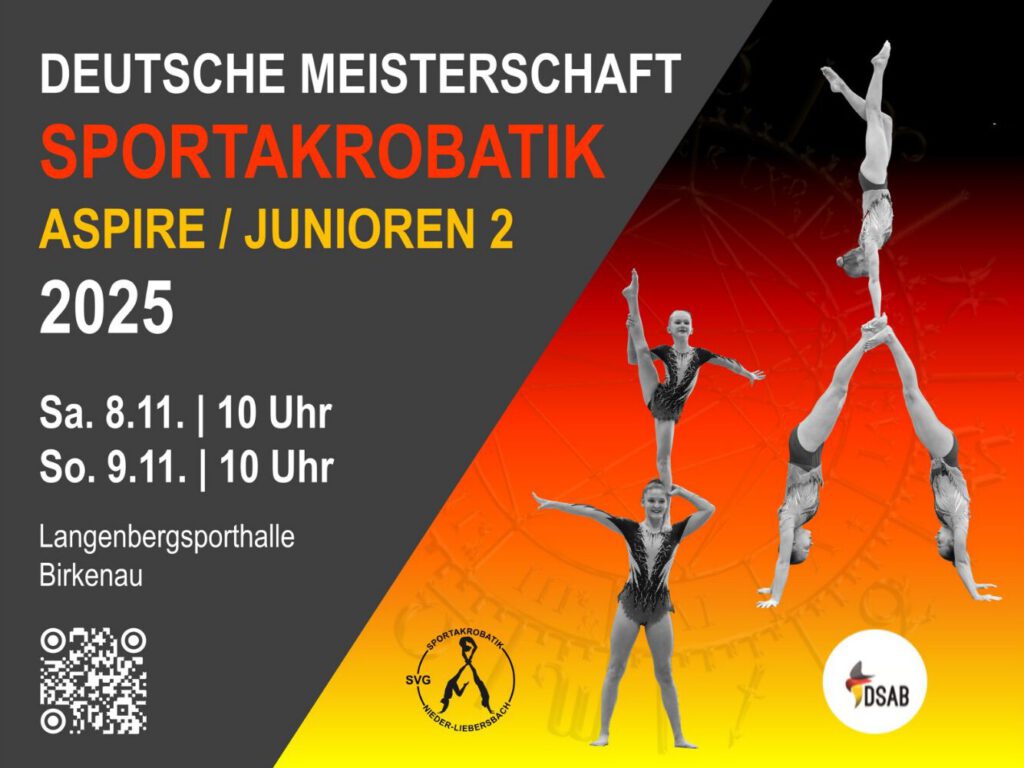 Die deutsche Elite der Sportakrobatik in den Wettkampfklassen Aspire und Junioren zwei präsentieren sich dieses Wochenende bei der SVG Nieder-Liebersbach. Am Samstag (8.11.) zeigen die Junioren2-Formationen ihre Balance- und Dynamik-Übungen, die Aspire-Formationen zeigen ihre Kombiübungen. Im Finale am Sonntag (9.11.) zeigen die besten Formationen beider Klassen ihre Kombi-Übung. Wettkampfbeginn ist an beiden Tagen um 10 Uhr in der Birkenauer Langenberghalle.
