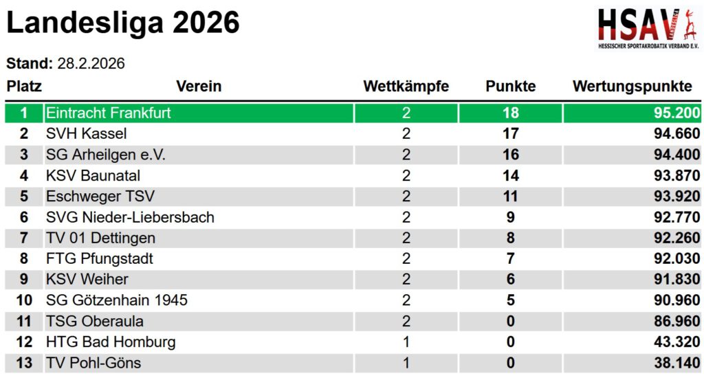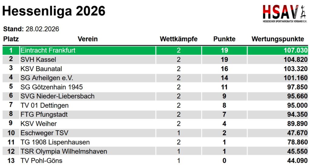 Mit dem ersten Platz in der Hessenliga wird es in der Gesamtwertung noch spannender. Nach zwei von vier Ligawettkämpfen liegen nun Kassel und Frankfurt mit 19 Punkten gleichauf. Dank der höheren erturnten Wertungspunkte (107,03 zu 104,82) führt Eintracht Frankfurt hauchdünn vor Kassel sowie Baunatal auf dem dritten Rang.